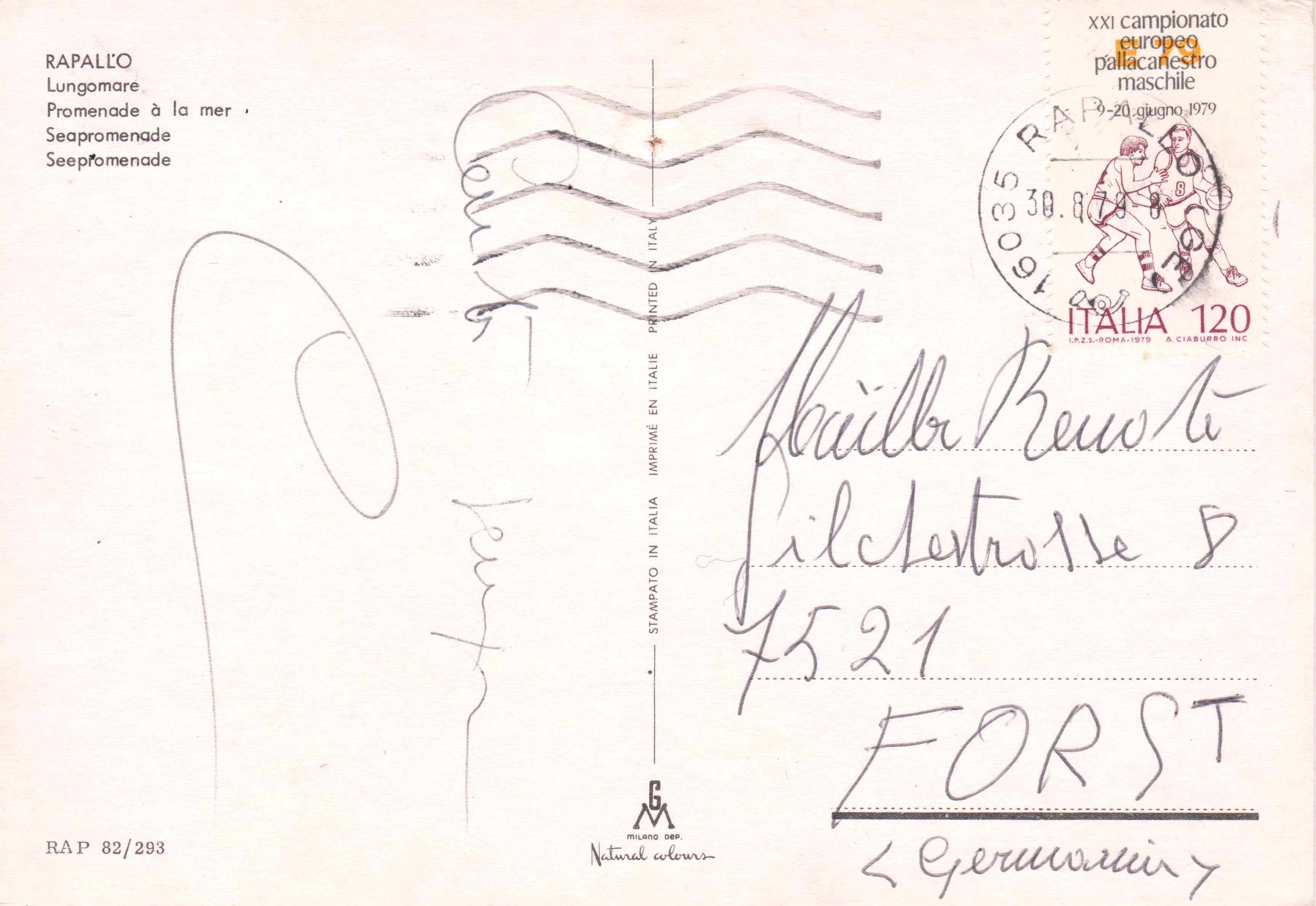 Die hier schon gezeigte Marke aus San Marino (MiNr 655) zu den Olympischen Sommerspielen 1960 mit einem Basketballspieler gibt es auch in einer anderen Farbe als geschnittene Marke (MiNr 673).