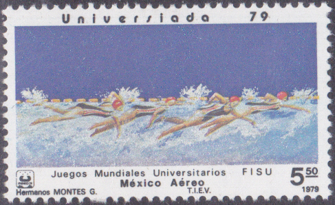 Auf dieser Marke aus Mexiko (MiNr 1642) zur Universiade 1979 in Mexiko-Stadt ist der Bewegungsablauf einer Schwimmerin beim Kraulschwimmen dargestellt.