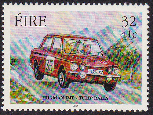 In der gleichen Serie erschien in Irland eine Marke (MiNr 1324), die Rosemary Smith im Hillman Imp bei der Tulpen-Rallye zeigt.