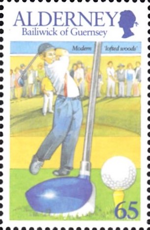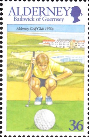 Auf der nächsten Marke dieser Serie (MiNr 175) sehen wir einen Golfspieler aus der Golfanlage des Golfklubs von Alderney (gegründet 1970).