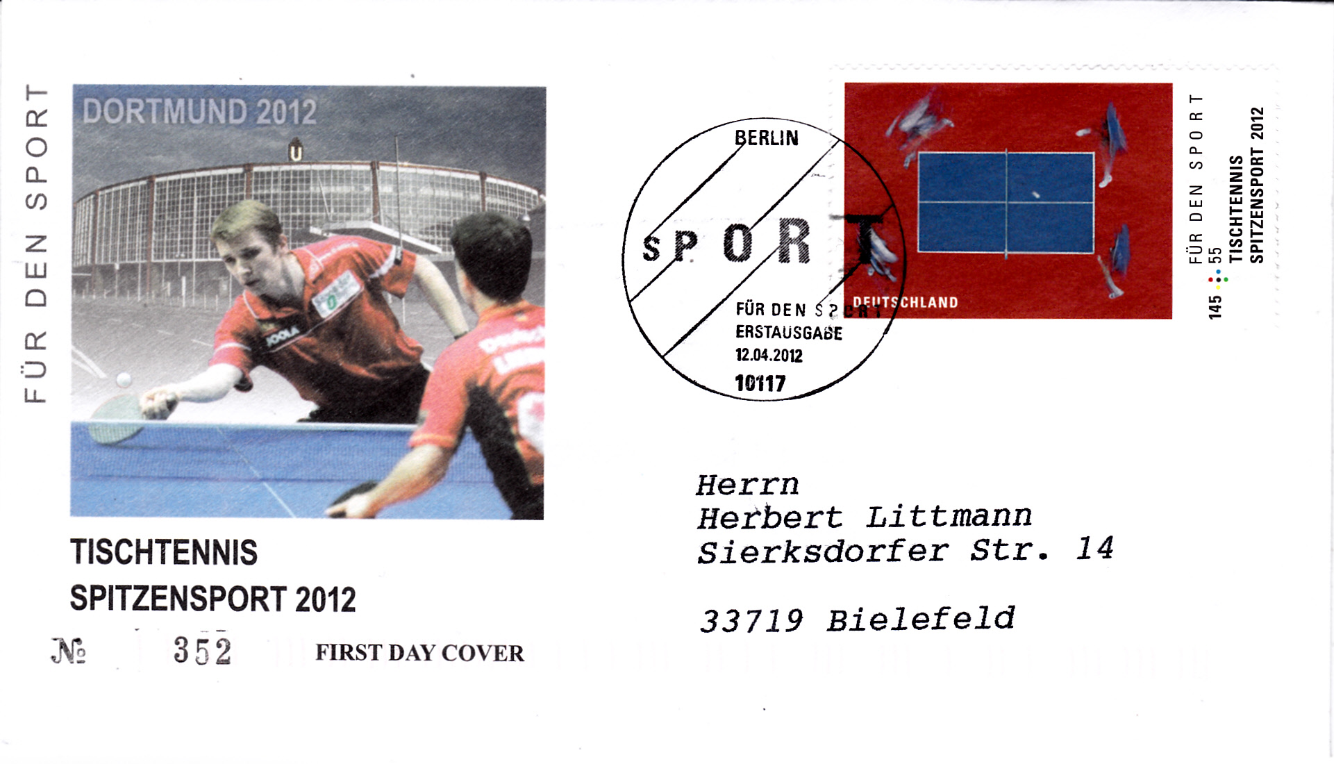 Zur Tischtennis-Mannschaftsweltmeisterschaften 2012 in Dortmund erschien bei der Deutschen Post in der Ausgabe "Für den Sport" auch eine Marke (MiNr 2926) mit einer Darstellung zu einem Doppel.