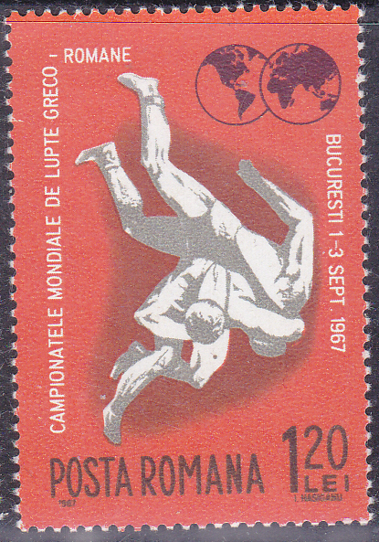 Mit einer weiteren Marke (MiNr 2617), die die zwei Hälften der Weltkugel zeigt, ist die Serie aus Rumänien zu den Ringer-Weltmeisterschaften 1967 im griechisch-römischen Stil komplett gezeugt.