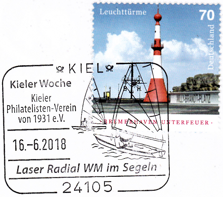 Im Sonderstempel vom 16.6.2018 während der Kieler Woche und der Laser Radial WM werden zwei Laser Boote gezeigt.