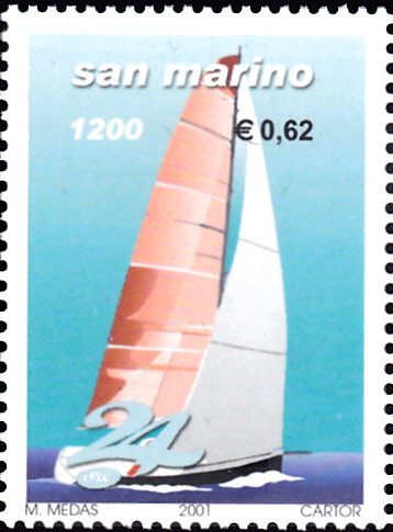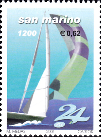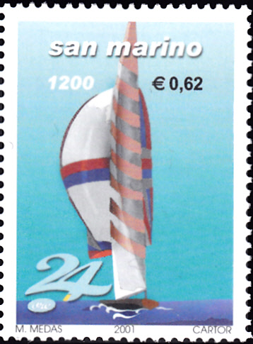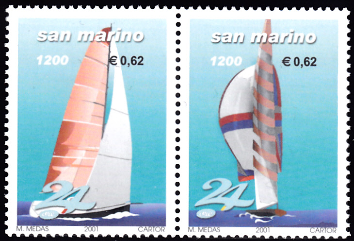 Zur Segelregatta „"24 Stunden von San Marino" erschien 2001 in San Marino eine Serie mit vier Marken, die Segeljachten mit unterschiedlichen Segelstellungen zeigen. Hier die beiden ersten Marken: