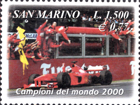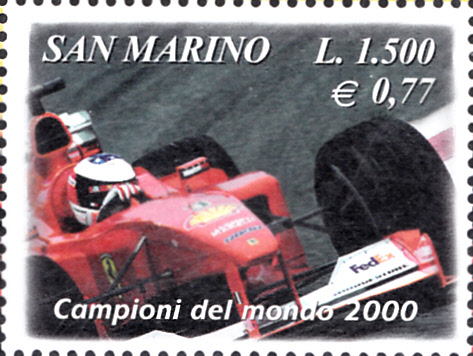 Auf dieser Marke aus San Marino (MiNr 1930) ist Michael Schumacher im Ferrari F1-2000 abgebildet.