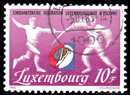 In Luxemburg gab es zum "50 Jahre Luxemburger Fechtverband" diese Marke (MiNr 1121) mit der Abbildung eines Fechtkampfes und dem Verbandsemblem.