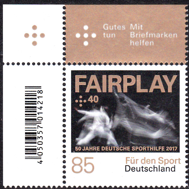 Die Marke zu 85+40 Cent der Ausgabe "50 Jahre Deutsche Sporthilfe" (MiNr 3308) zeigt Fechter beim Kampf. Die Darstellung soll "Faiplay" symbolisch darstellen.