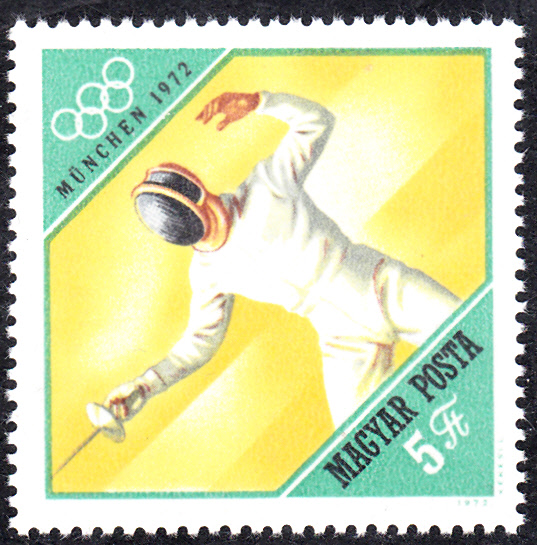 Diese Marke aus einer Serie zu den Olympischen Spielen 1972 aus Ungarn (MiNr 2780 A) zeigt einen Fechter.