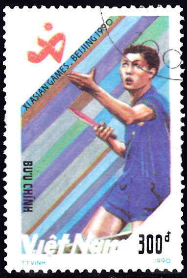 Aus einer Serie aus Vietnam zu den 11. Asienspiele in Peking stammt diese Marke (MiNr 2206) mit einem Tischtennisspieler beim Aufschlag.
