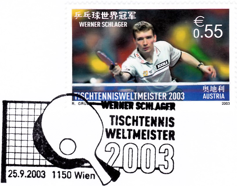 FDC mit der bereits gezeigten Marke mit dem Tischtennisspieler Werner Schlager aus Österreich zum Gewinn der Weltmeisterschaft im Tischtennis im Jahre 2003 mit dem dazu passenden Sonderstempel aus Wien.