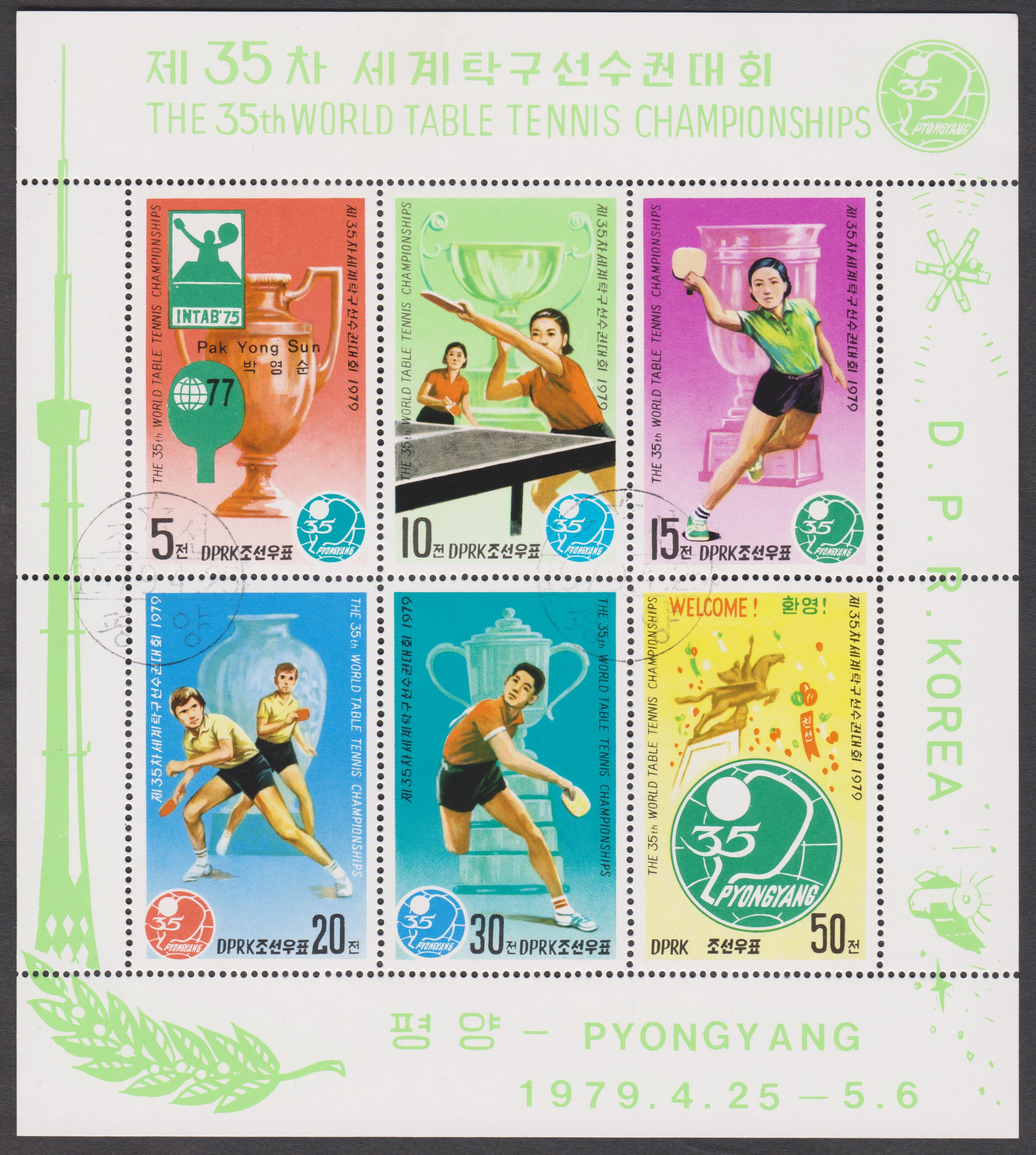 Zu den 35. Tischtennis-Weltmeisterschaften in Pyongyang erschienen Nordkorea MiNr. 1828 - 1833 zusammenhängend gedruckt im Kleinbogen: