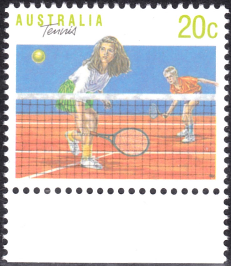 Auf dieser Marke aus Australien (MiNr 184 I A) werden Tennisspieler/in bei einem Doppel gezeigt. Die gezeigte Marke hat die Zähnung A = gez. K 14:14 1/4. Es gibt sie auch mit der Zähnung F = gez. K 13 1/4:13 3/4.
