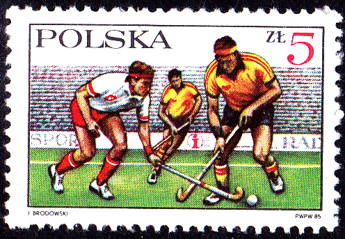 Zum Thema "60 Jahre Polnischer Feldhockey-Verband" gibt es diese Marke (MiNr 2990) mit einer Spielszene beim Hockey.