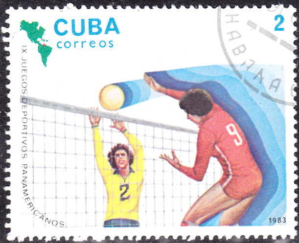 Es folgt eine Marke aus Kuba (MiNr 2748) zu den Panamerikanischen Spiele in Caracas mit einer Abbildung zum Volleyball.