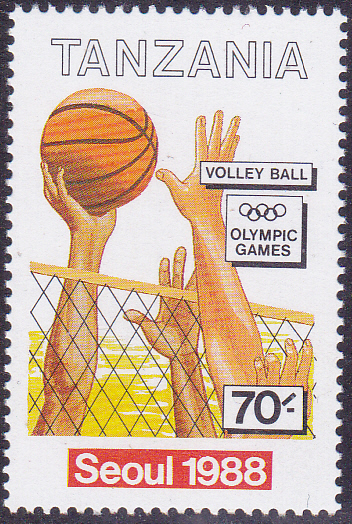 In einer Serie erschien in Tansania diese Marke (MiNr 474) mit einer Darstellung zum Volleyball.