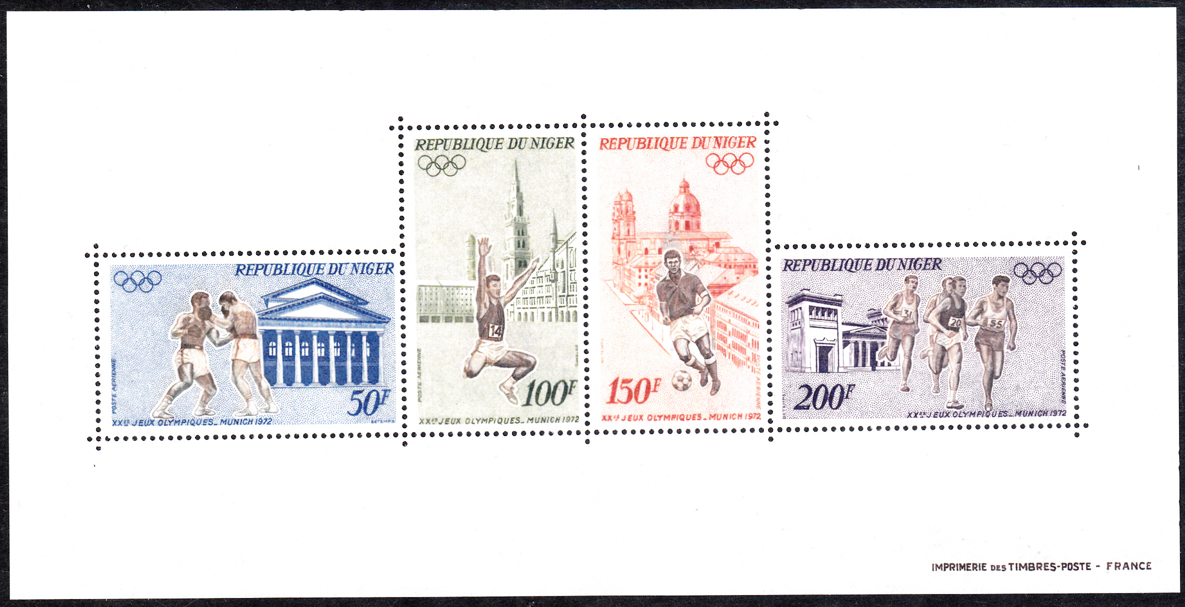 Aus dem Niger kommt diese Marke (MiNr 331) zu den Spielen in München mit zwei Boxer beim Kampf im Markenbild.