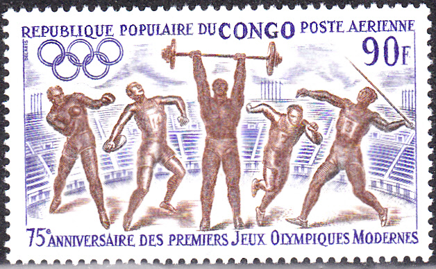 Diese Marke aus Kongo-Brazzaville (MiNr 313) zeigt in einem der Olympischen Ringe auch zwei Boxer im Kampf.