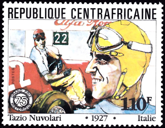 Auf dieser Marke aus der Zentralafrikanischen Republik zu 110 Franc (MiNr 779) wird ein Porträt von Tazio Nuvolari gezeigt.