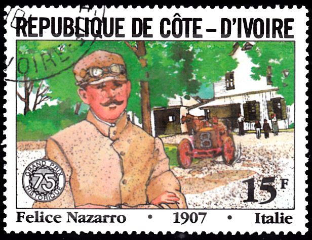 Auf dieser Marke aus der Elfenbeinküste (MiNr 706) wird Felice Nazzaro gezeigt.