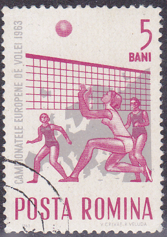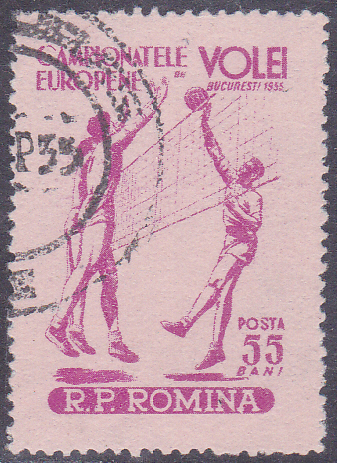 Zu dieser EM erschien in Rumänien diese Marke (MiNr 1517) mit einer Spielszene am Netz (Blockabwehr).