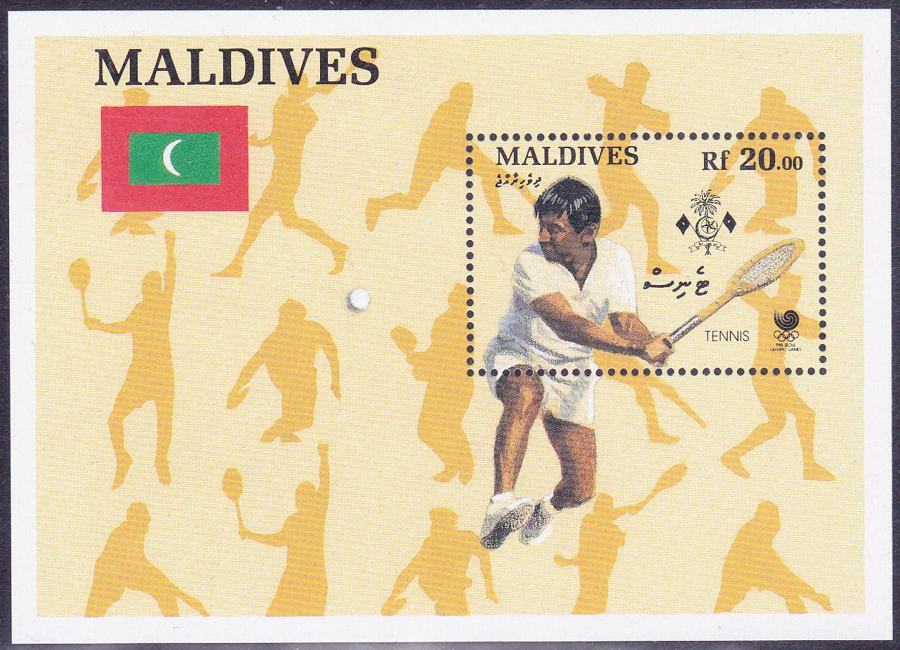 In Malediven ist zu den Sommerspielen 1988 ist dieser Block (MiNr Block 144 mit Marke MiNr 1311) mit einem Tennisspieler erschienen.