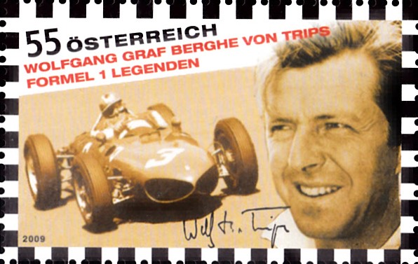Diese Marke aus Österreich (MiNr 2809) zeigt ein Porträt von Wolfgang Graf Berghe von Trips undn ihn in einem Rennwagen.