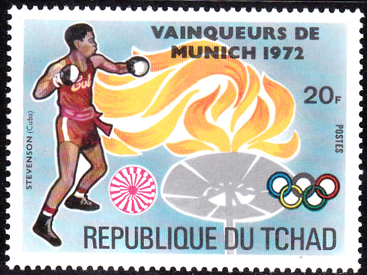 Hier kommt eine weitere Marke (MiNr 627 A) zum Gewinn der Goldmedaille durch Teófilo Stevenson (Kuba) im Schwergewicht (über 81 kg) beim Boxen. Sie ist im Tschad erschienen.
