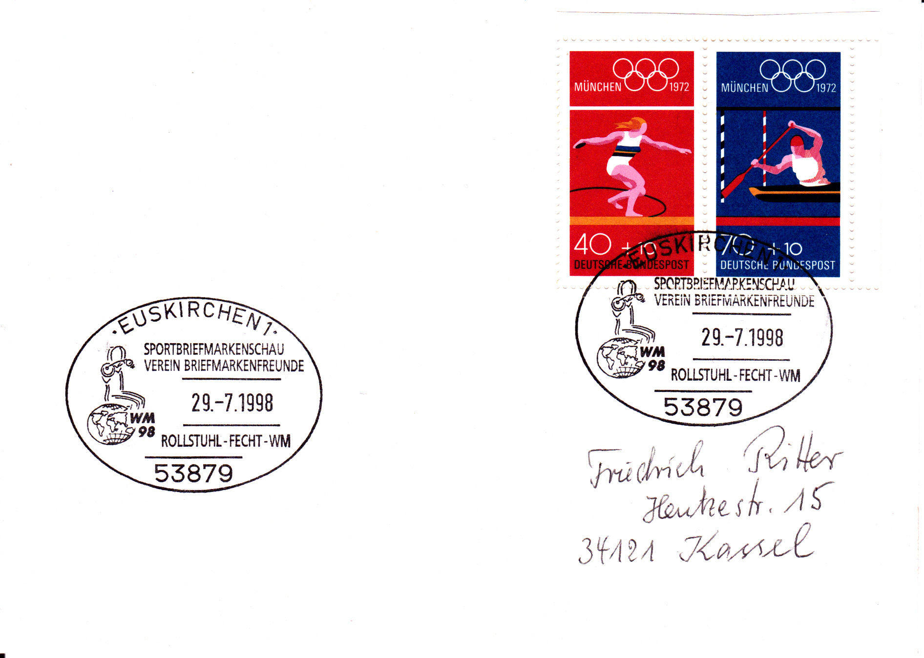 Sonderstempel aus 53879 Euskirchen 1 vom 29.7.1998 zu einer Briefmarkenschau anlässlich der Rollstuhl-Fecht-WM.
