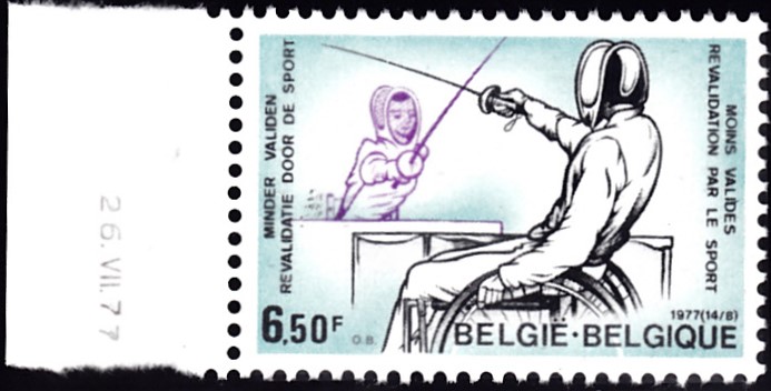 In Belgien ist in einer Serie "Sport" eine Marke (MiNr 1916) erschienen, die eine Szene beim Rollstuhl-Fechten zeigt. Die hier gezeigte Marke vom Bogenrand trägt das Druckdatum.