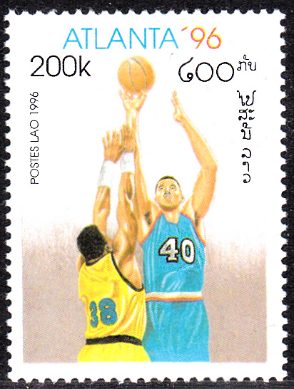 Zu den Olympischen Spielen 1996 in Atlanta erschien im Kongo - Brazzaville diese Marke (MiNr 1385 A) mit einer Spielszene beim Basketball. Die Marke gibt es auch geschnitten und als Block.