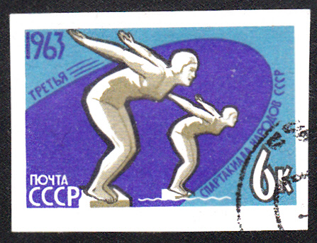 Am 27.Juni 1963 erschien in der Sowjetunion in einer Serie zur 3. Spartakiade der Völker der UdSSR diese Marke (MiNr 2775B) mit der Abbildung von Schwimmerinnen am Startblock. Die Marke gab es am 27. Juli 1963 auch als gezähnte Variante (MiNr 2775A).