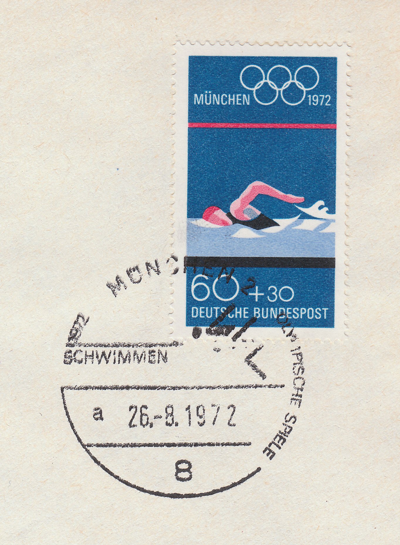 Zum Thema Schwimmen wurde während der Olympischen Spiele 1972 in München am 26.08.1972 dieser Sonderstempel abgeschlagen, in diesem Falle thematisch passend auf einer MiNr. 722: