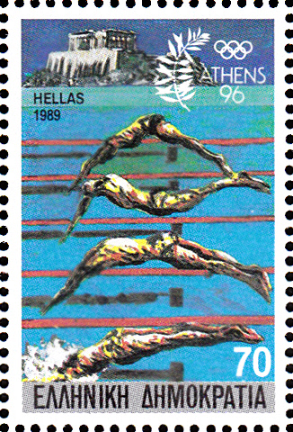 In einer Serie zur Bewerbung Athens als Austragungsort der Olympischen Spiele 1996 erschien dieser Wert (MiNr 1719 A) mit der Abbildung von Schwimmer nach dem Startsprung.