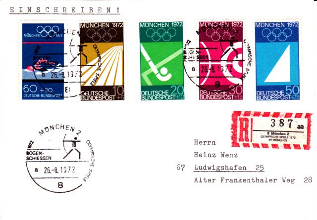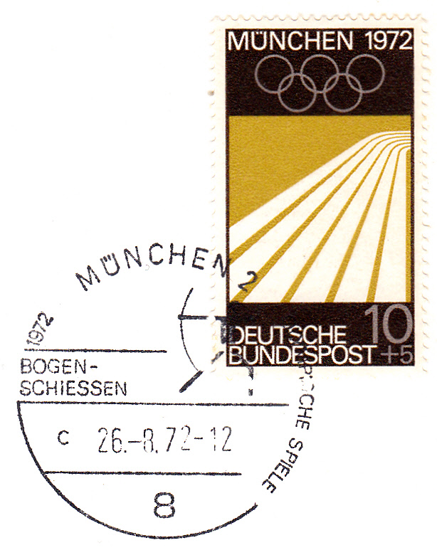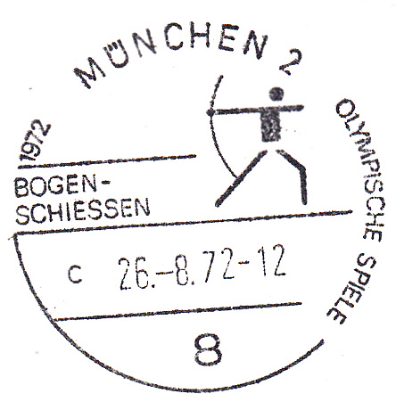Hier nun der Sonderstempel "Bogenschießen" von den Olympischen Spiele 1972 in München mit dem Kennbuchstaben "b" mit Uhrzeit.