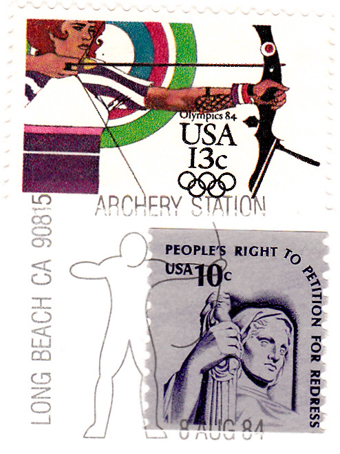 Zu den Olympischen Spielen 1984 in Los Angeles erschien in den USA auch eine Marke mit einer Sportlerin beim Bogenschießen im Markenbild).