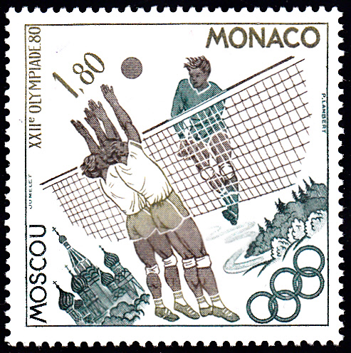 Zu den Olympischen Spielen 1980 in Moskau erschien in Monaco in einer Serie diese Marke zu 1,80 Fr (MiNr 1418) mit der Abbildung einer Spielszene beim Volleyball.