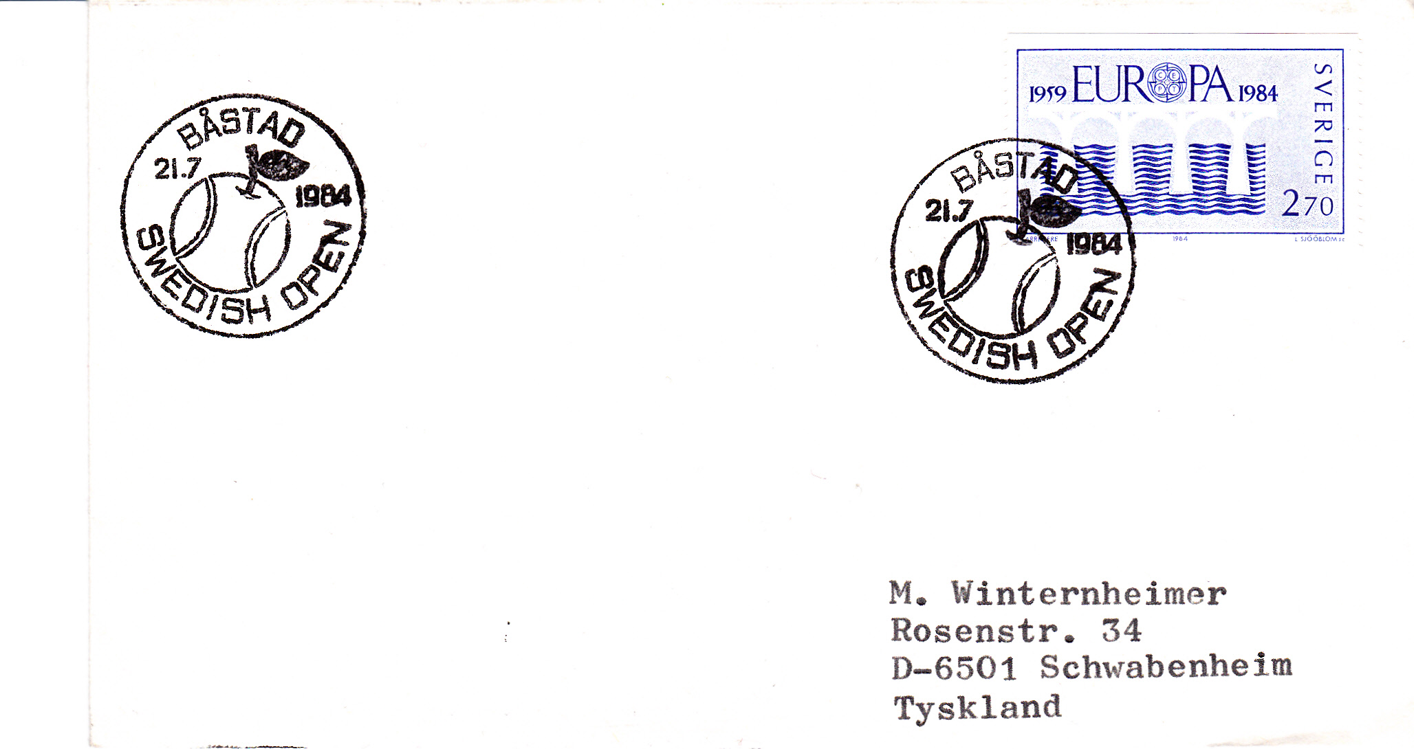 Hier ein Sonderstempel aus Båstad zur Swedish Open vom 21.7.1984 auf einem Briefumschlag nach Schwabenheim.