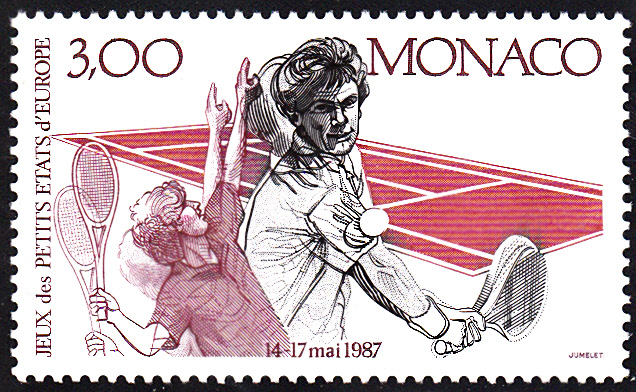 Hier eine Marke aus Monaco (MiNr 1808) zu den 2. Sportspiele der europäischen Kleinstaaten in Monaco mit der Abbildung eines Tennisplatzes und zwei Tennisspier, einer beim Aufschlag und einer mit einem beidarmigen Rückhand.