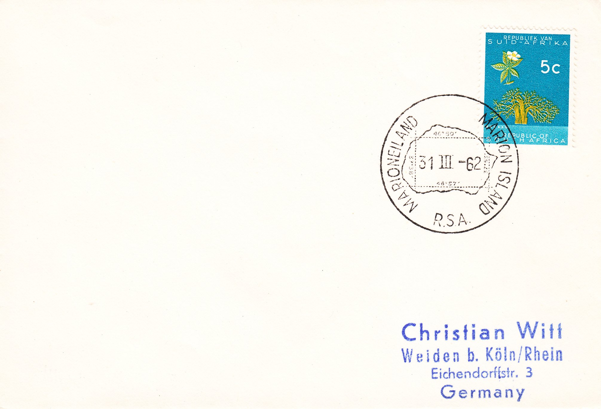 Die Frankatur auf diesem Beleg wurde am 31.03.1962 mit einem Stempel entwertet, der einen Umriss der Marion-Insel im Stempelbild zeigt: