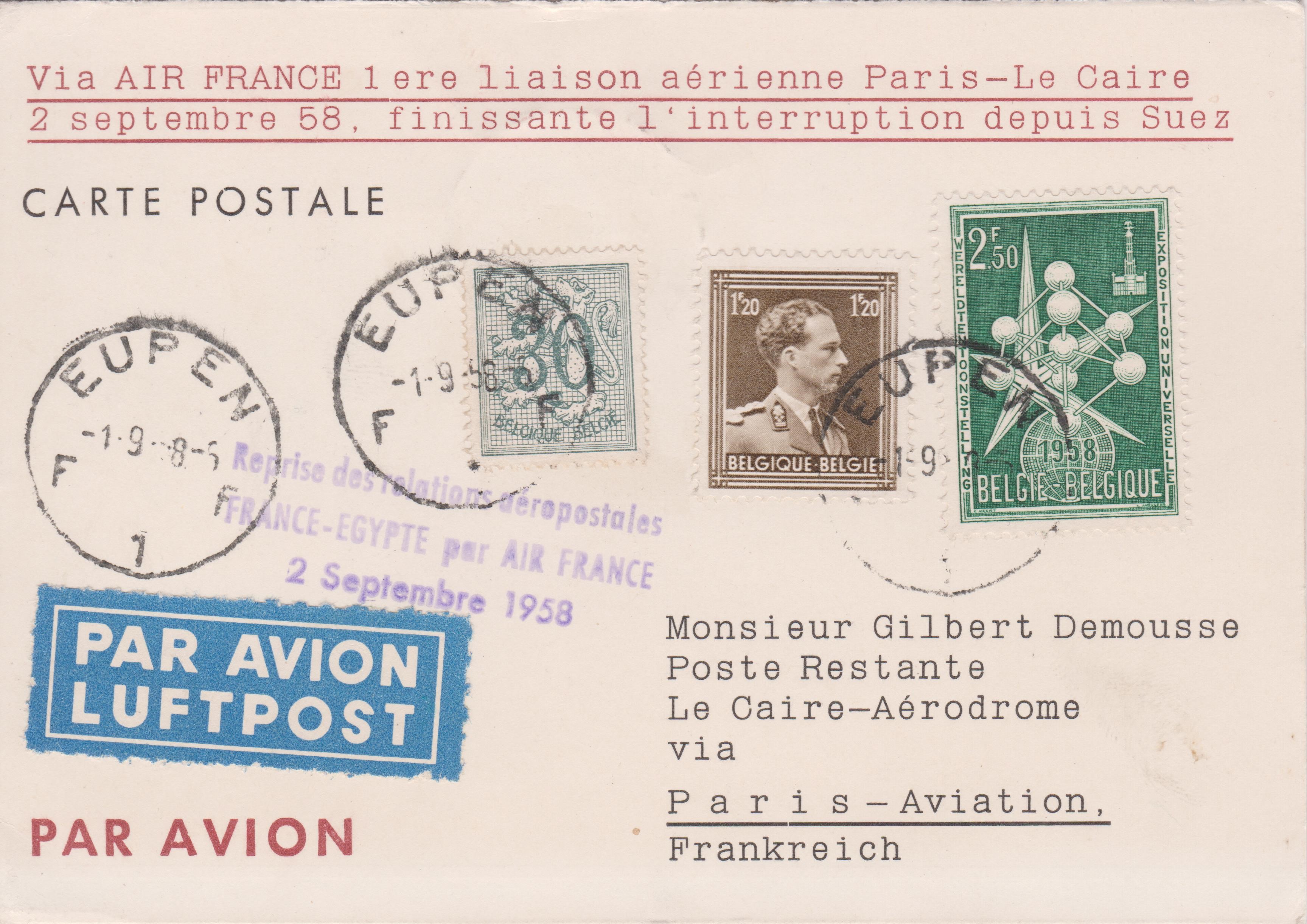 Dieser Beleg wurde am 01.09.1958 in EUPEN aufgegeben und am 02.09.1958 mit der AIR FRANCE von Paris nach Kairo befördert:
