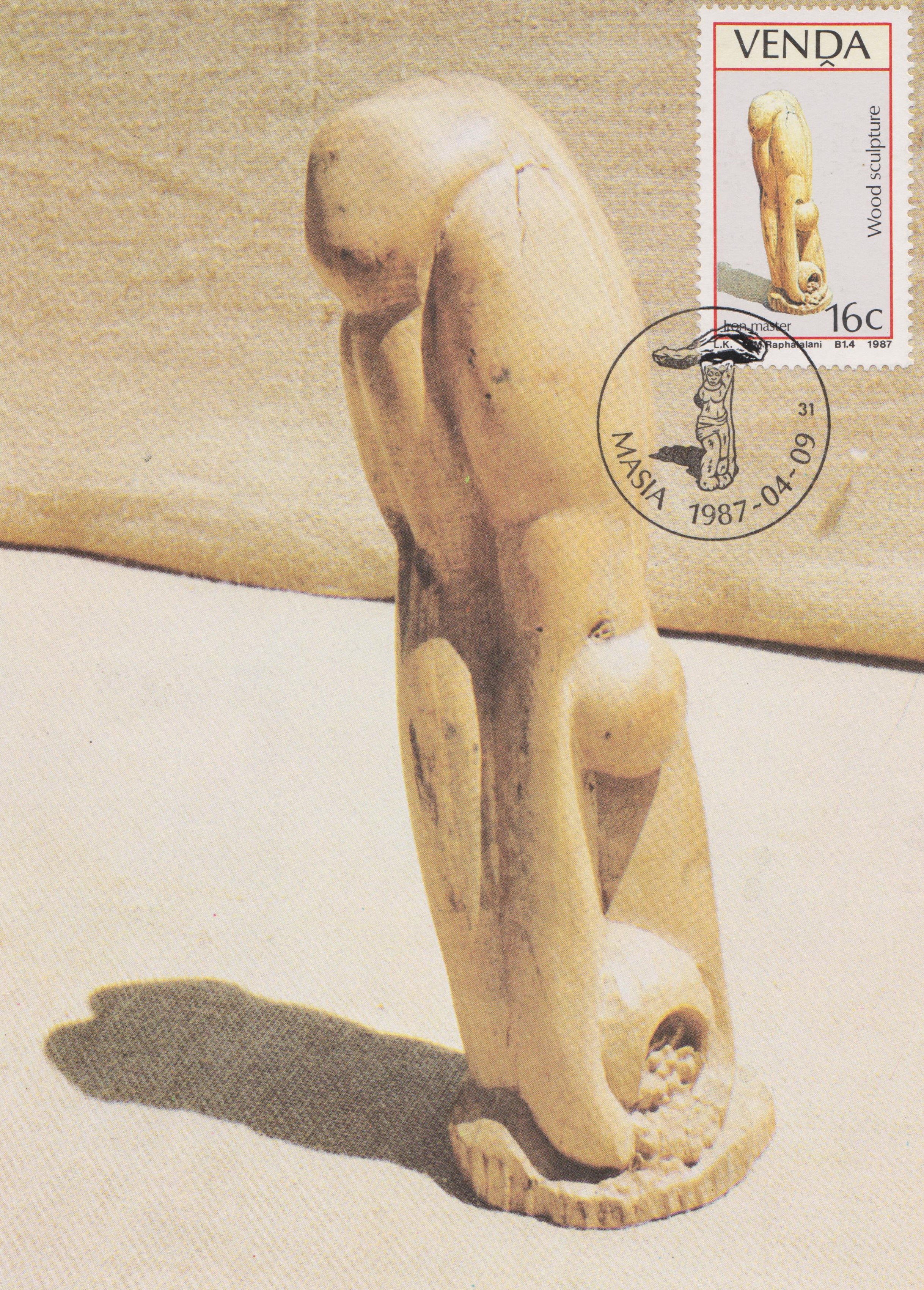 Hier eine Maximumkarte der MiNr. 155 vom 09.04.1987 zum Thema "Holzskulpturen", betitelt "Iron master" = Eisenmeister: