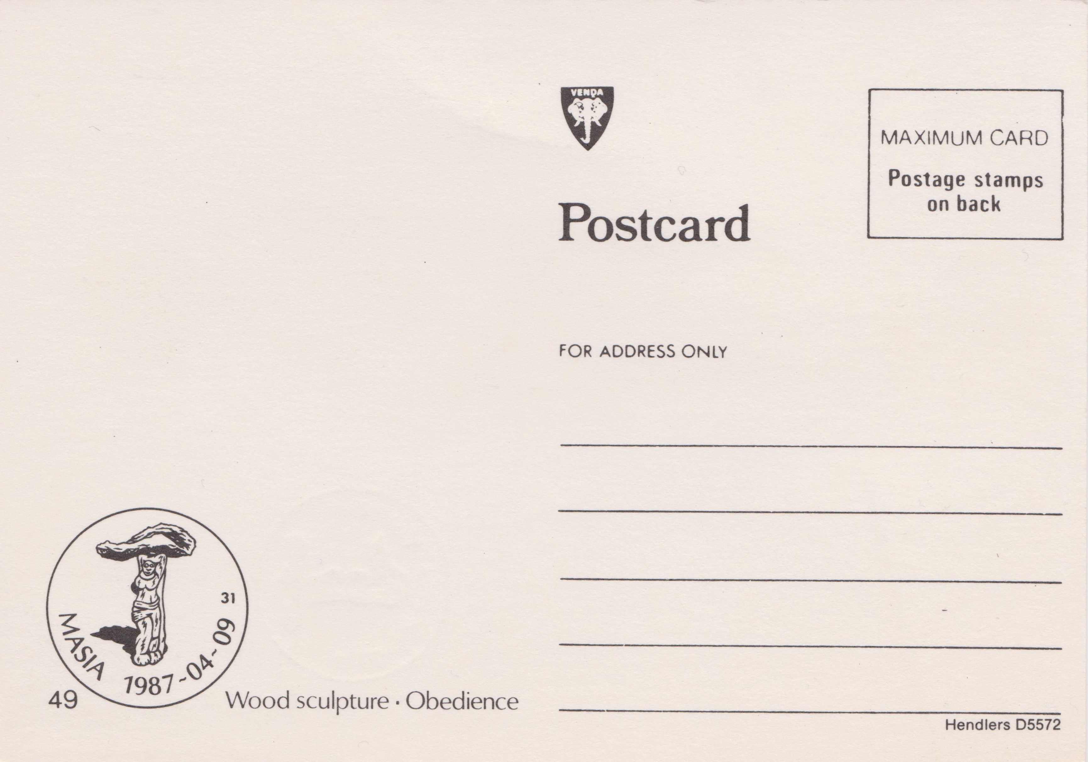 Hier eine Maximumkarte der MiNr. 158 vom 09.04.1987 zum Thema "Holzskulpturen", betitelt "Obedience" = Gehorsam: