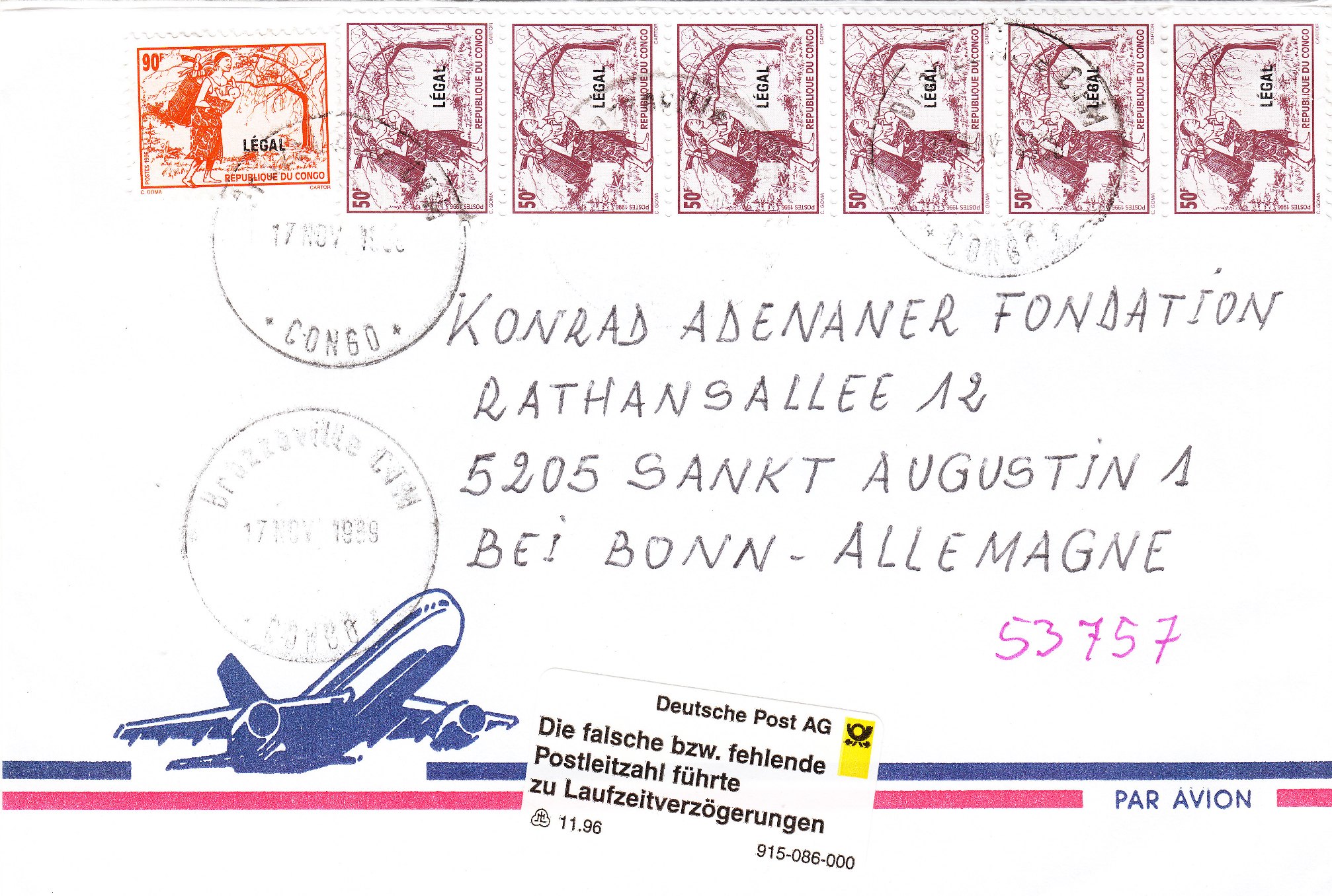 Hier ein Beleg vom 17.11.1999, aufgegeben in Brazzaville, der eine solche Frankatur mit Aufdruck "LÉGAL" zeigt: