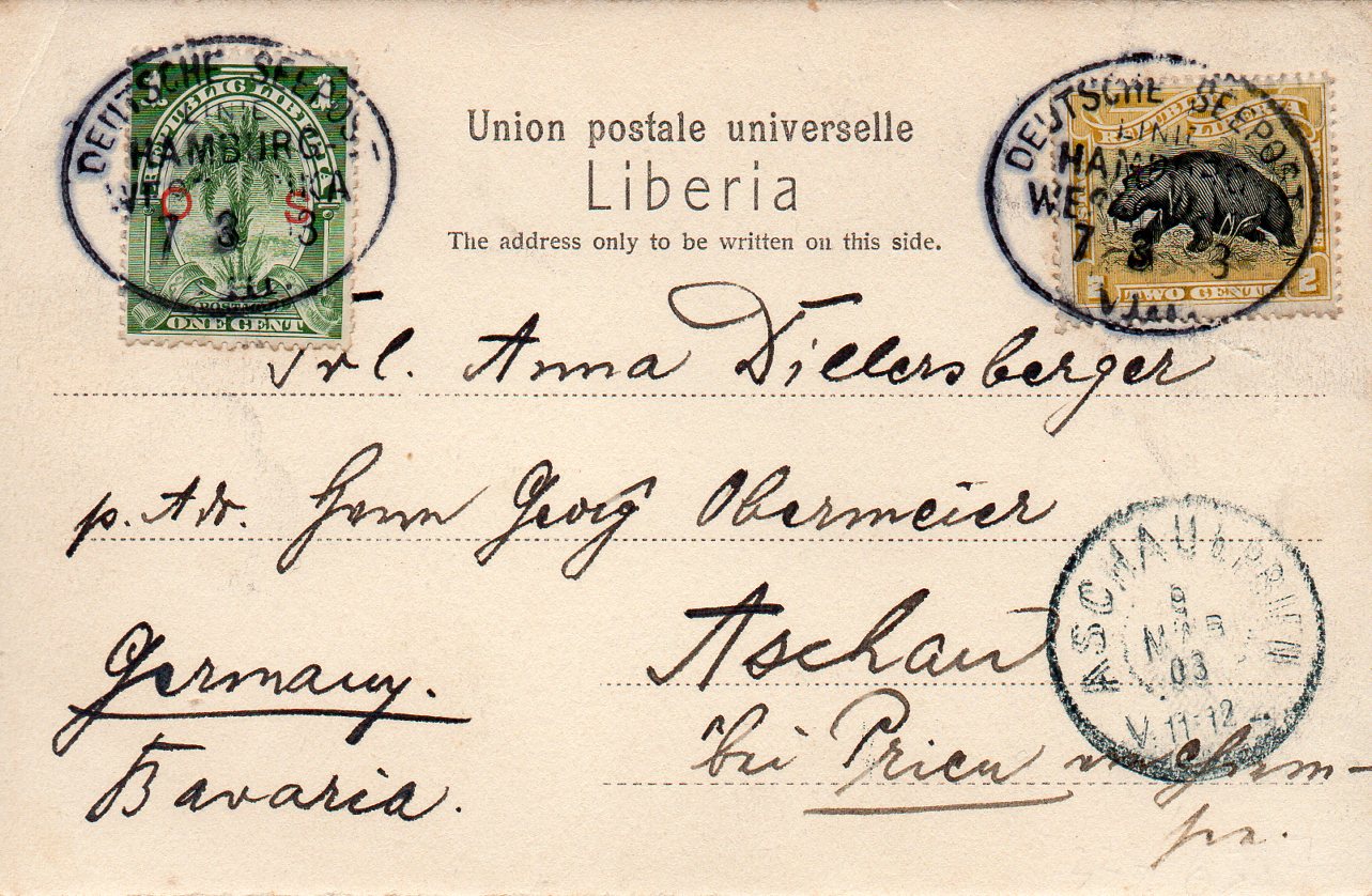 Aus Liberia (nicht zu verwechseln mit Lybien!) stammt diese Karte, die per Schiffspost über Hamburg nach Aschau am Chiemsee gelaufen ist.