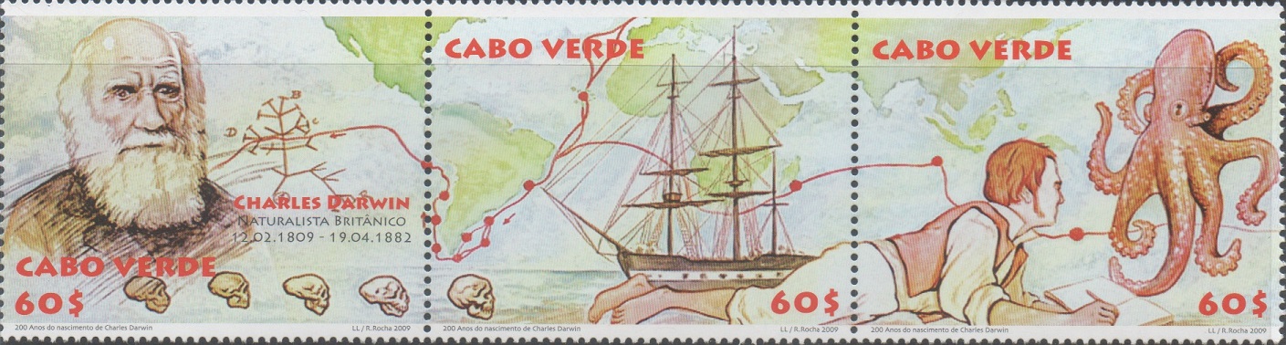 Zum 200. Geburtstag von Charles Darwin erschien diese Ausgabe aus drei zusammen hängenden Briefmarken.