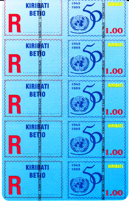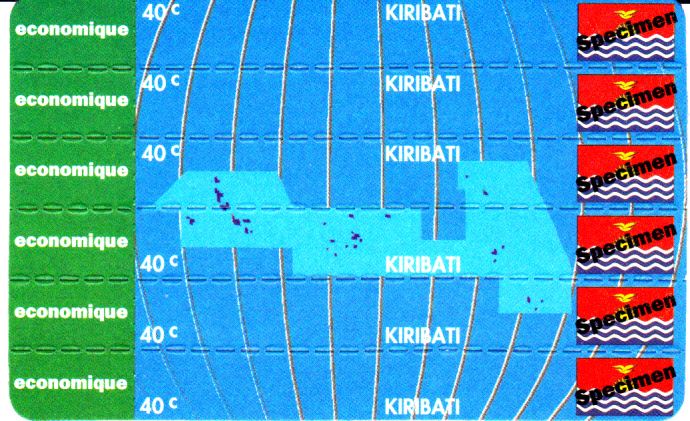 Hier zeige ich eine vermutlich im November 1993 in Kiribati erschienene Stampcard. Diese Konfektionierungsform wurde von einer schwedischen Firma mit dem Namen "PostLine (International) AB" entwickelt und verschiedenen Postverwaltungen unter dem Namen "STAMPCARD TM" angeboten. Die Stampcards haben die Größe der damals häufig benutzten Telefonkarten und konnten somit auch über die gleichen Automaten verkauft werden. Die Stampcard zeigt die Abbildung einer "Landkarte" (oder besser Seekarte mit einzelnen Landflecken, den Inseln) von Kiribati und der Flagge (vermutlich ursprünglich MiNr 631-636). Die 6 waagerechten Markenstreifen sind selbstklebend und auf einem Träger aufgebracht. Links von jeder Marke befindet sich ein abtrennbares Feld mit Angabe der Versendungsart "economique". Beim hier gezeigten Exemplar handelt es sich um eine Musterkarte, erkennlich am Aufdruck "Specimen" über den Flaggen der Marken. Die Stampcard und die Marken sind inzwischen nicht mehr im Michelkatalog verzeichnet (die MiNr 631 bis 654 gibt es nicht mehr), offenbar weil der amtliche Charakter nicht eindeutig zu sein scheint. Die Machart der Stampcard ist ähnlich der von mir unter Korea-Nord eingestellten Stampcard.