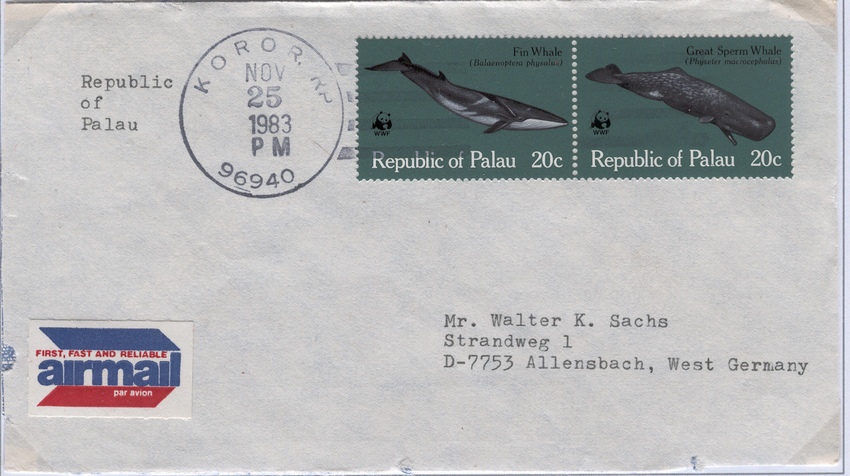 dort das 1. Haischutzgebiet der Welt. Brief aus der ehemaligen Hauptstadt Koror mit 2 auch dort heimischen Walen.