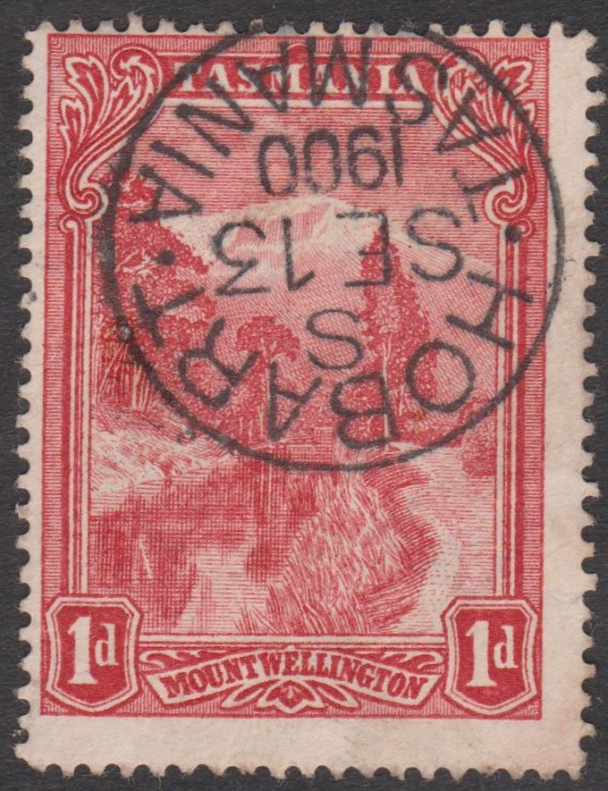 Hier drei Exemplare des Postwertzeichens Tasmanien MiNr. 62, das als Motiv die Bergspitze des Wellington zeigt: