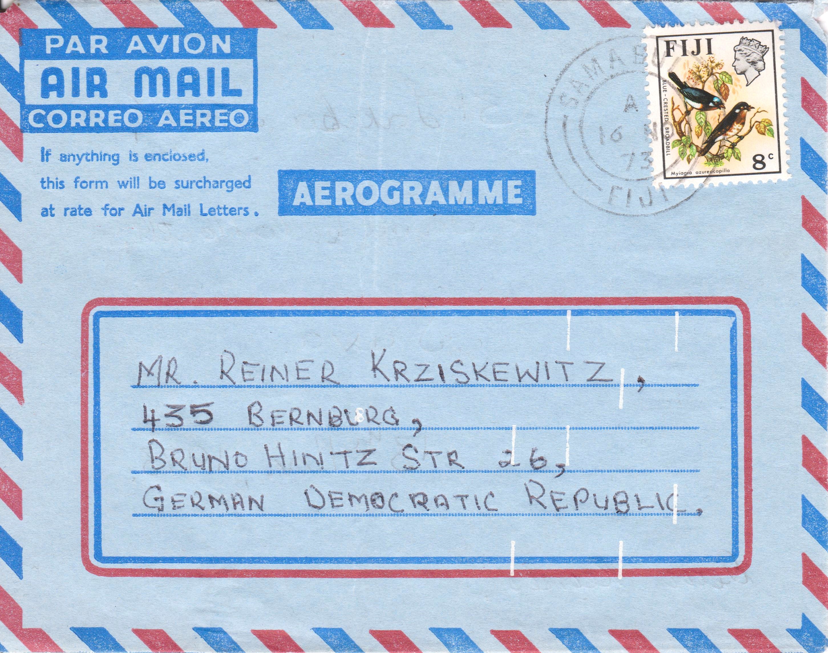 Einzelfrankatur FIJI am 16.11.1973 auf Aerogramm nach Deutschland: