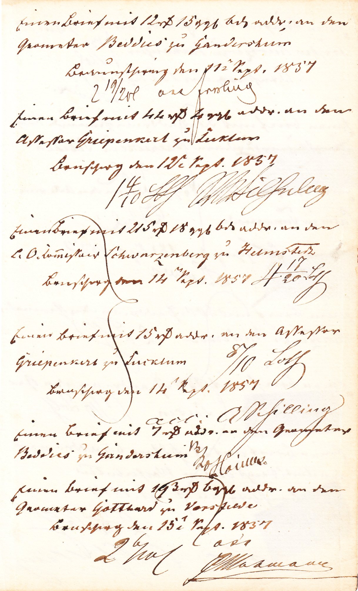 Es handelt sich um eine Seite aus einem Posteinlieferungsbuch aus Braunschweig aus dem Jahre 1857, wobei viermal die Einlieferung von jeweils einem Brief mit Wertangabe quittiert wurde.